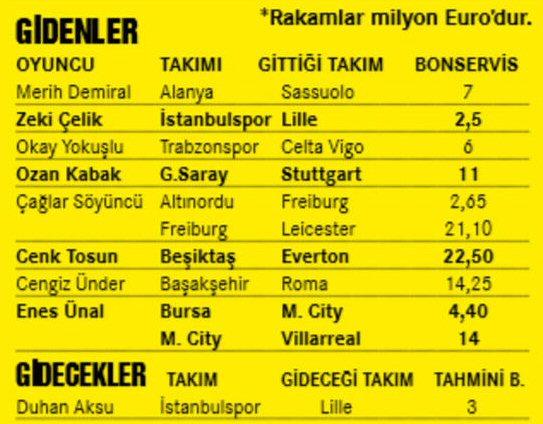 Merih, Zeki, Okay, Enes ve Ozan gibi 25 yaş altı milli oyuncular Avrupa'nın yolunu tuttu. Bu transferler için 105 milyon Euro bonservis bedeli ödenirken, Duhan Aksu'nun da Lille'e transferi an meselesi.