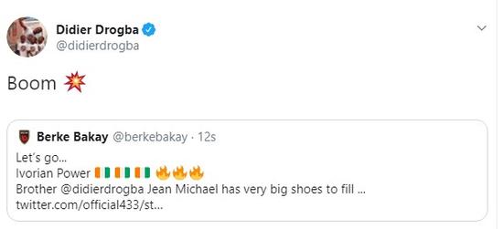 Didier Drogba, twitter'dan bir Galatasaray taraftarının paylaşımını "Boom" yazarak paylaştı. Bomba anlamına gelen paylaşım kısa sürede Galatasaraylı taraftarlardan büyük beğeni aldı.