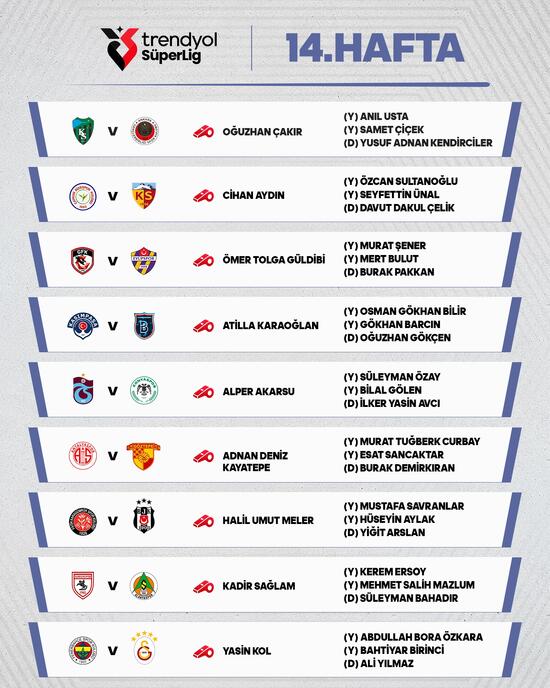 Türkiye Futbol Federasyonu (TFF) Merkez Hakem Kurulundan (MHK) yapılan açıklamaya göre, ligde 14. hafta müsabakalarında düdük çalacak hakemler şunlar: