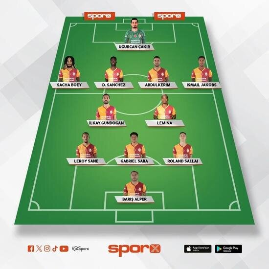 Galatasaray: Uğurcan Çakır, Sacha Boey, Davinson, Abdülkerim, Jakobs, İlkay Gündoğan, Lemina, Leroy Sane, Gabriel Sara, Sallai, Barış Alper.