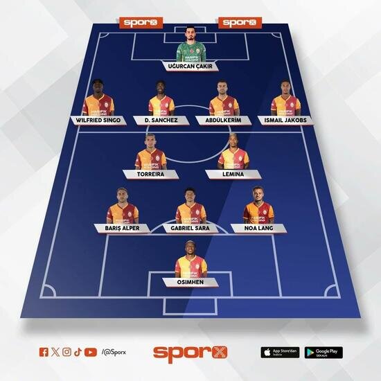 Galatasaray: Uğurcan, Singo, Davinson, Abdülkerim, Jakobs, Lemina, Torreira, Barış, Sara, Lang, Osimhen