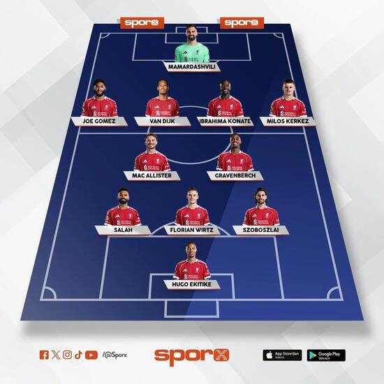 Liverpool: Mamardashvili, Gomez, Van Dijk, Konate, Kerkez, Mac Allister, Gravenberch, Salah, Wirtz, Szoboszlai, Ekitike.