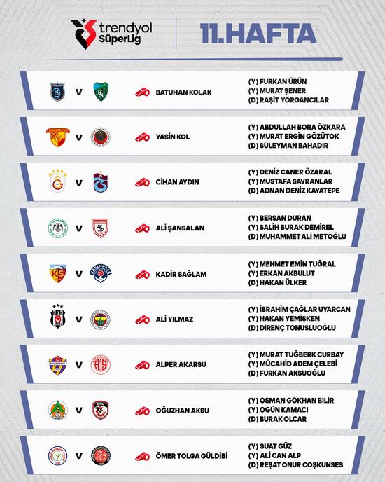 Türkiye Futbol Federasyonu Merkez Hakem Kurulunun açıklamasına göre, ligde 11. hafta maçlarında görev yapacak hakemler şunlar: