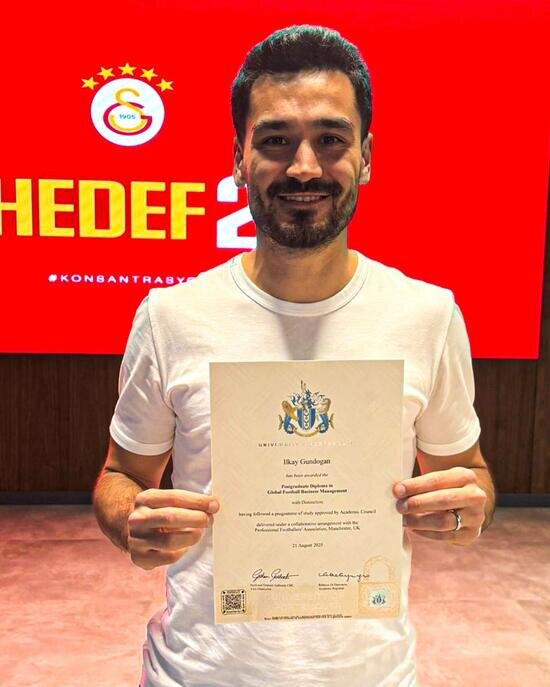 Galatasaray'ın tecrübeli orta saha oyuncusu İlkay Gündoğan, Portsmouth Üniversitesinden Küresel Futbol İşletme Yönetimi yüksek lisans diploması aldı.