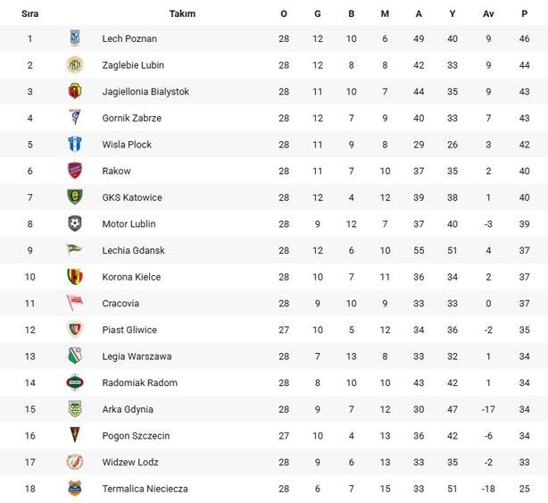 Lech Poznan'ın 46 puanla liderlik koltuğunda oturduğu ligde, son sıradaki LKS Nieciecza hariç 17 takımın matematiksel olarak şampiyonluk şansı devam ederken, ligde kalmayı garantileyen takım henüz çıkmadı.