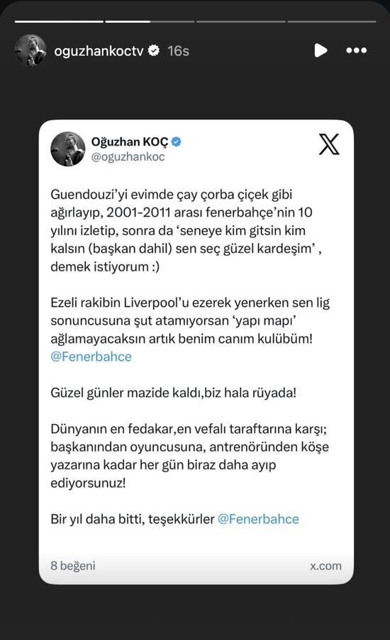 Maç sonrası en dikkat çeken tepki ise Fenerbahçeli kimliğiyle bilinen Oğuzhan Koç’tan geldi. Sosyal medyada yaptığı paylaşımla kendi kulübüne sert sözlerle yüklendi.